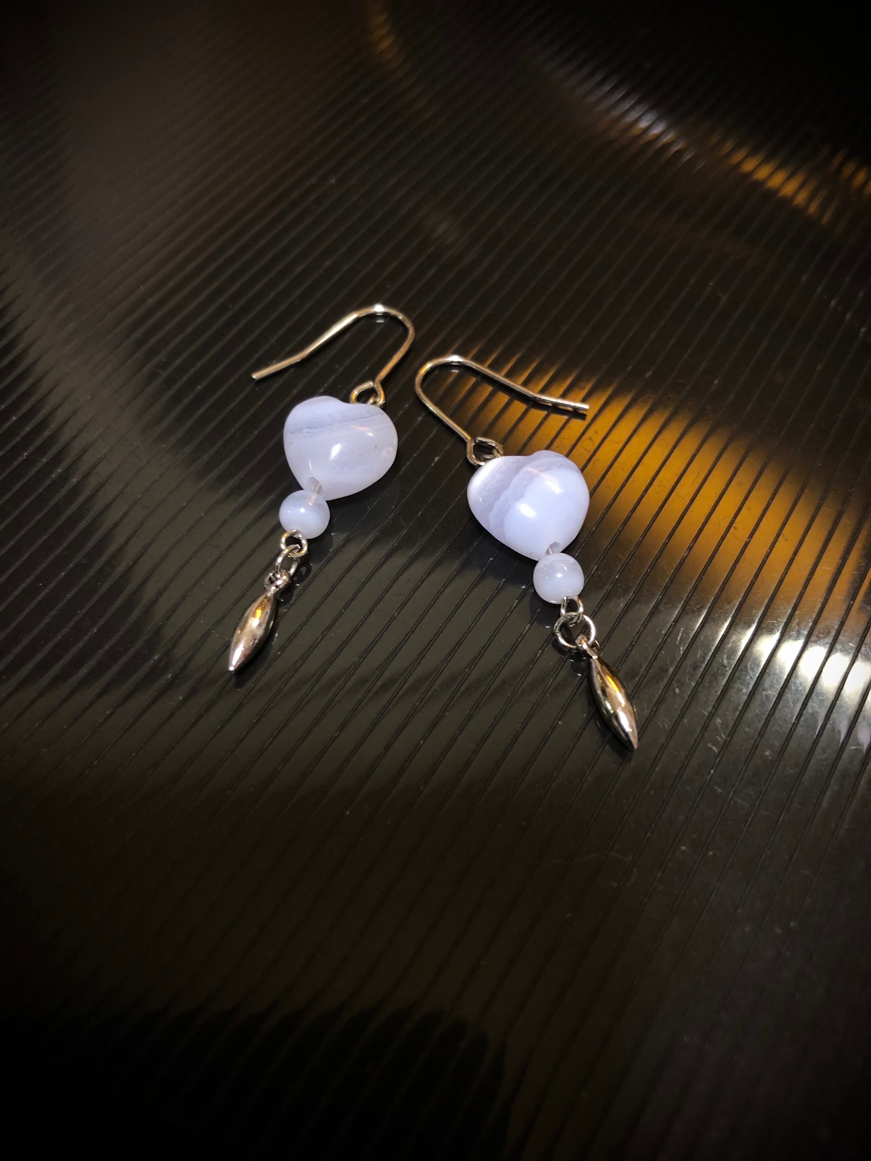 天然石ピアス パワーストーン ブルーレースアゲート ハート型 約10㎜ ラウンド 約4㎜ ブラジル産 メタルパーツ ツララ 8×2㎜ ハンドメイド シルバーカラー チェーン式 セミロング ステンレス フックピアス