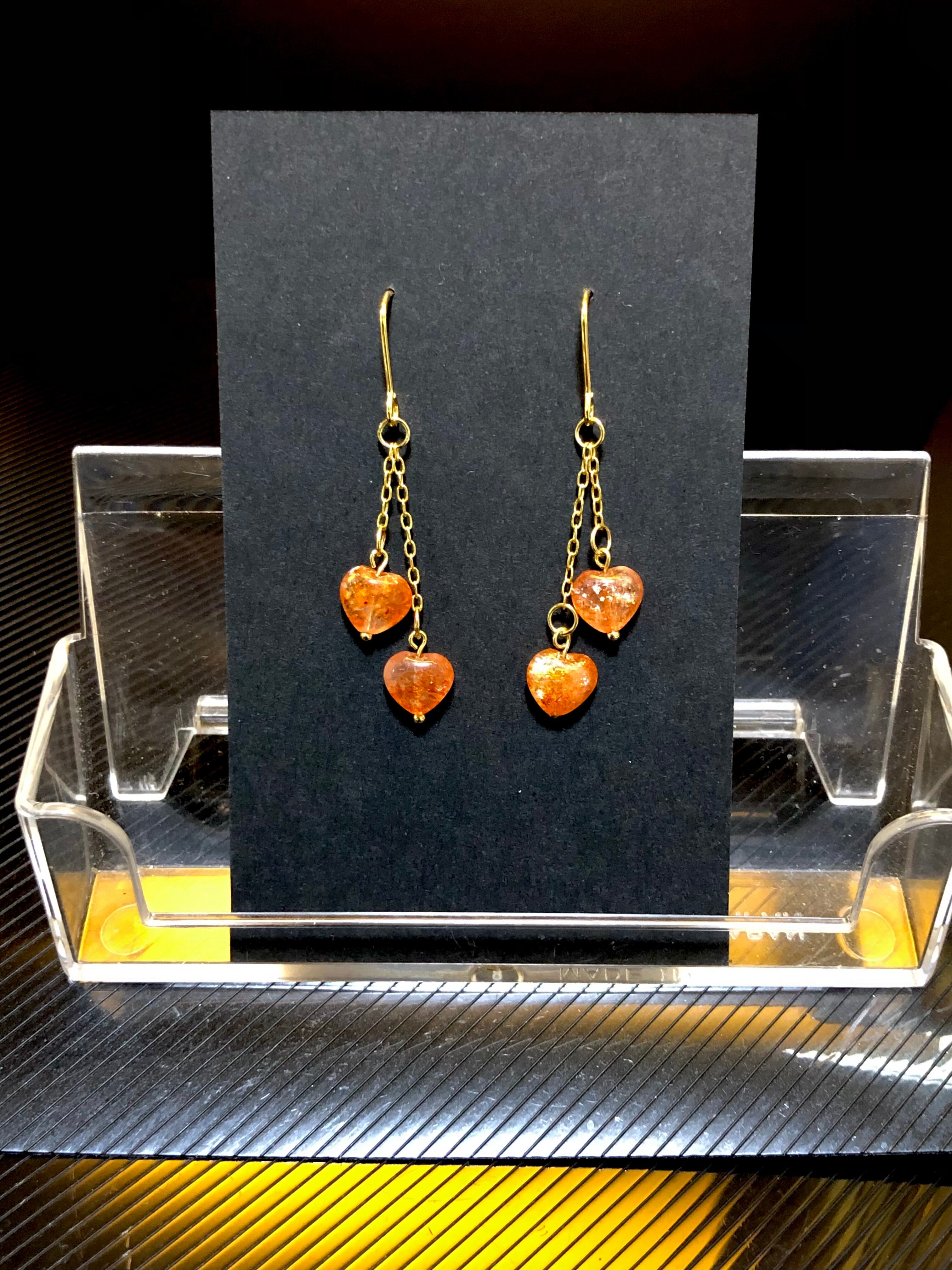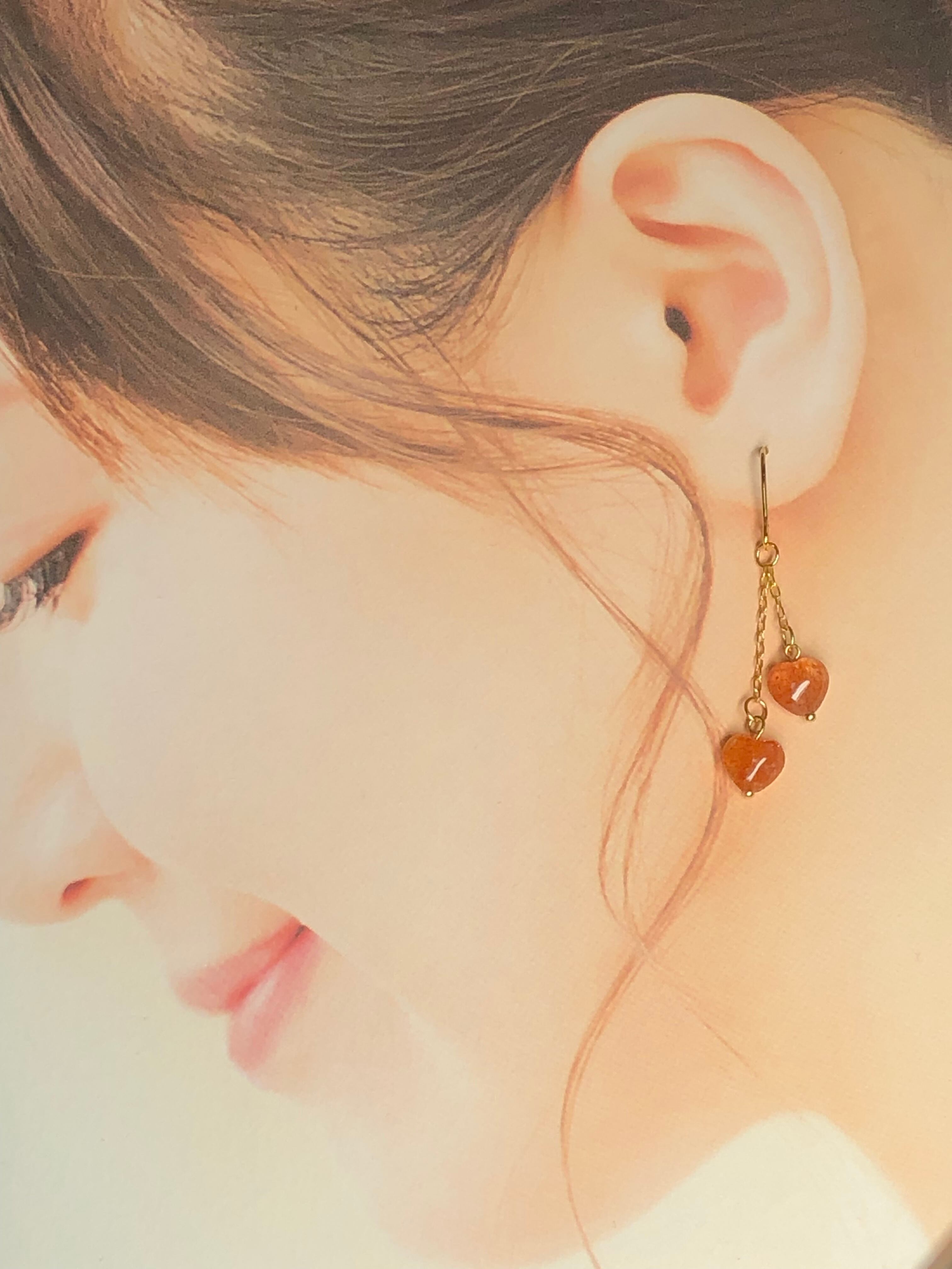天然石ピアス パワーストーン サンストーン ハート型 約7.5〜8mm タンザニア産 ハンドメイド ゴールドカラー チェーン式 セミロング ステンレス フックピアス