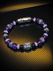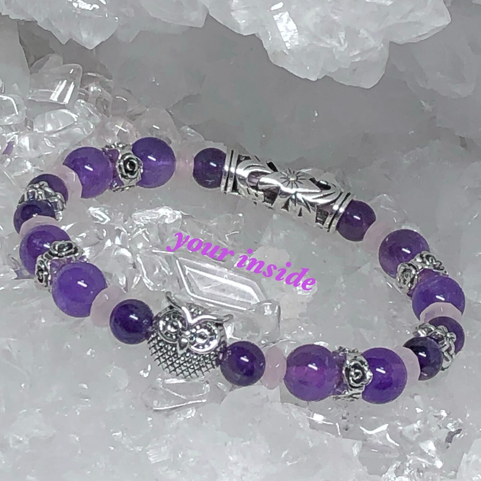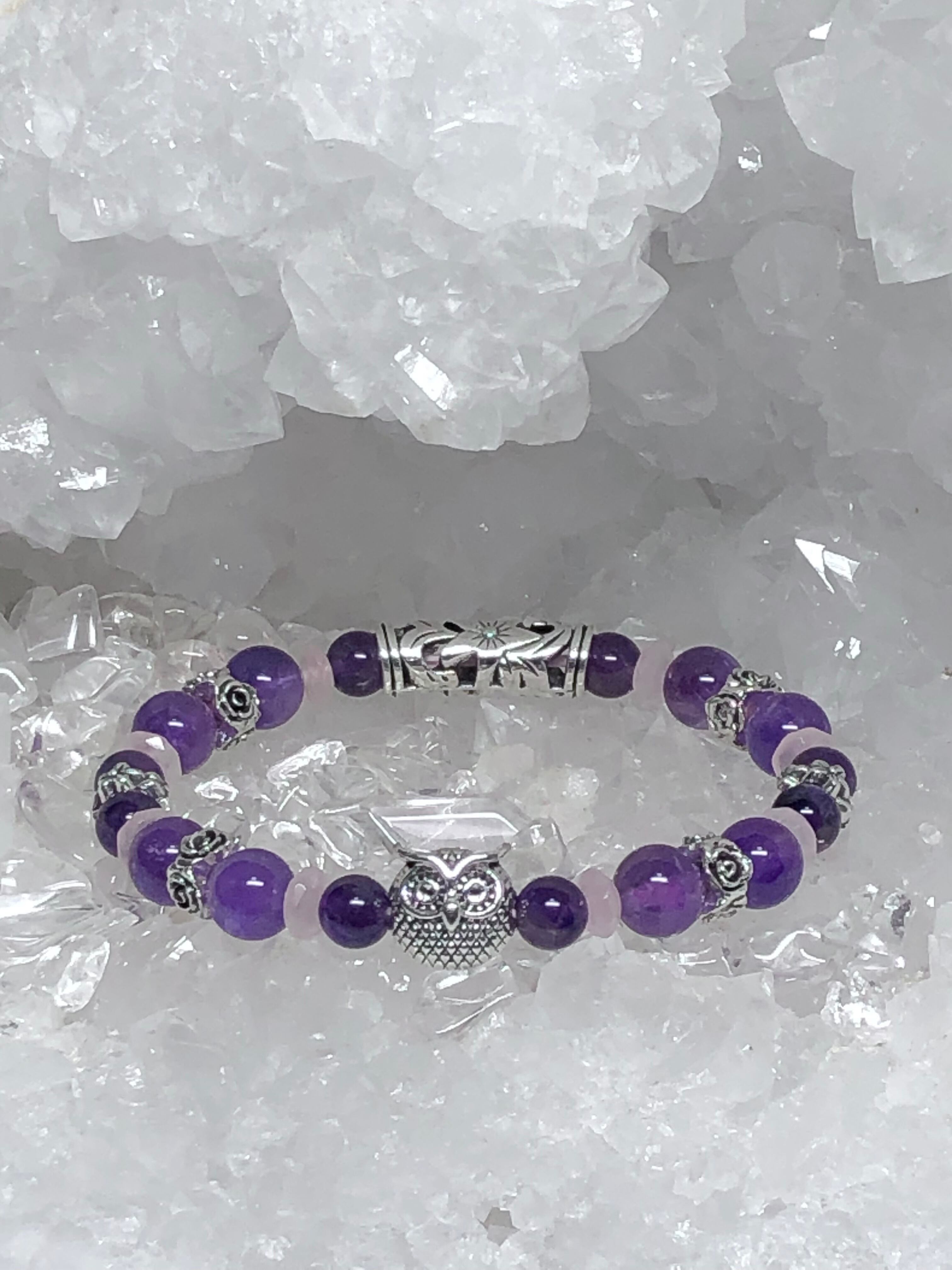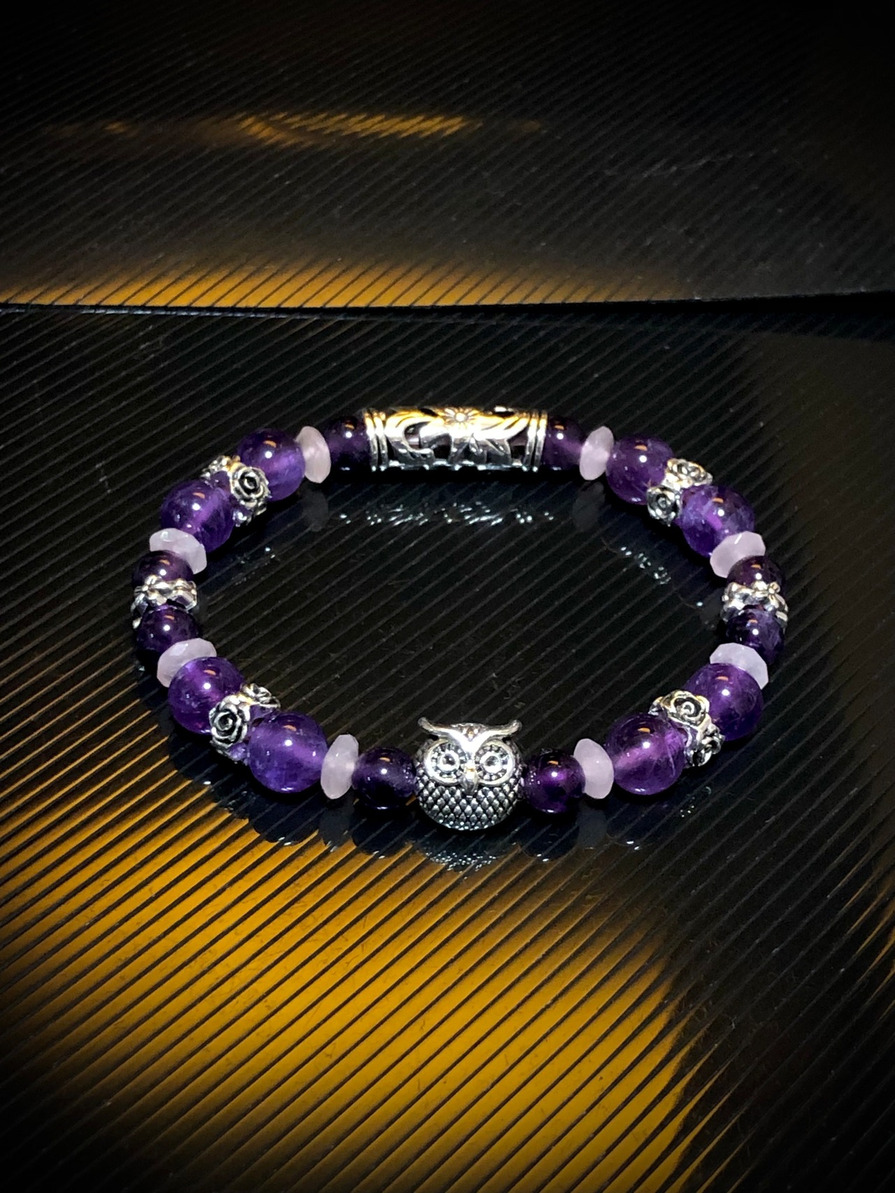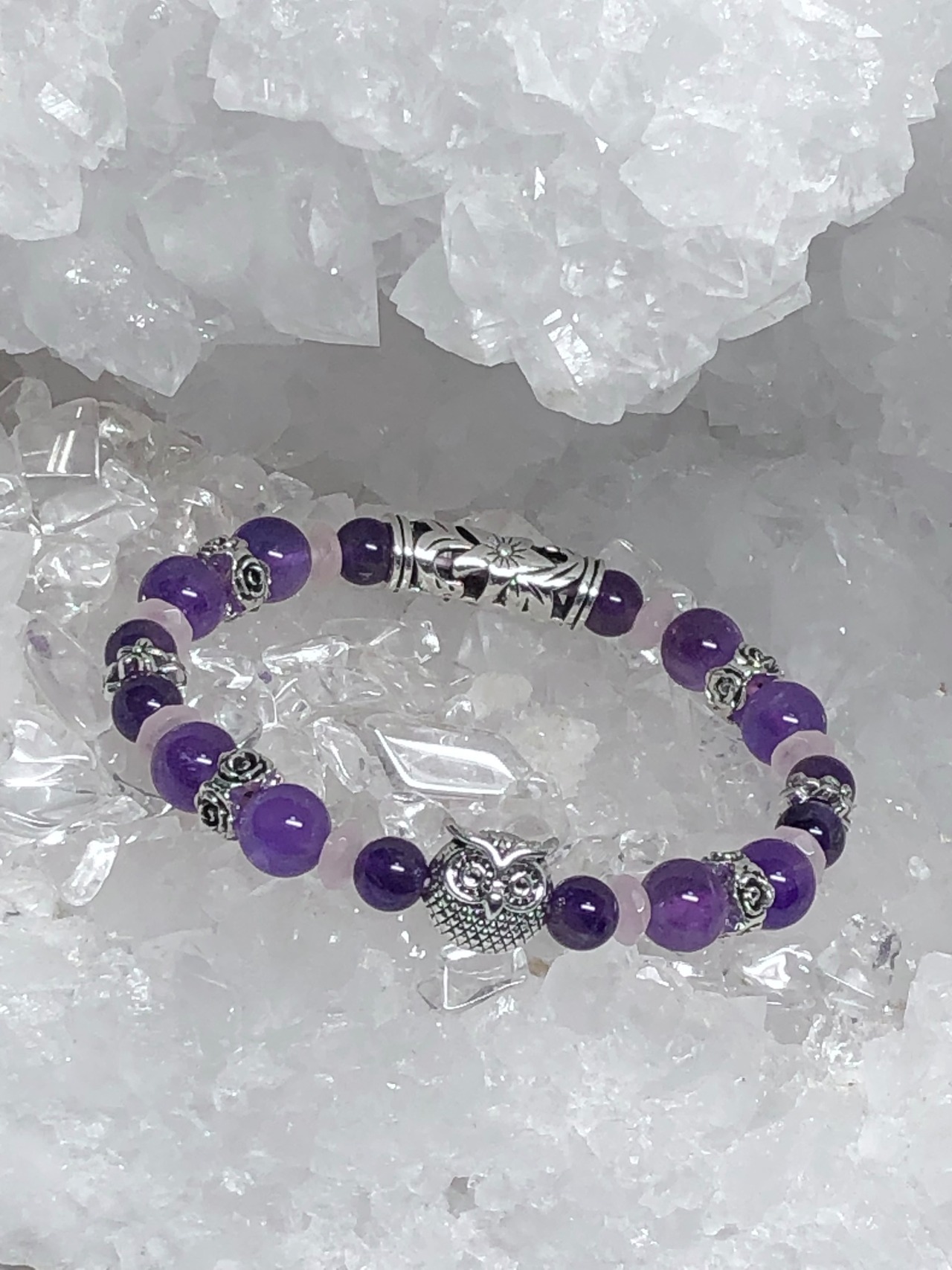 フクロウ アメジスト ローズクォーツ 天然石ブレスレット