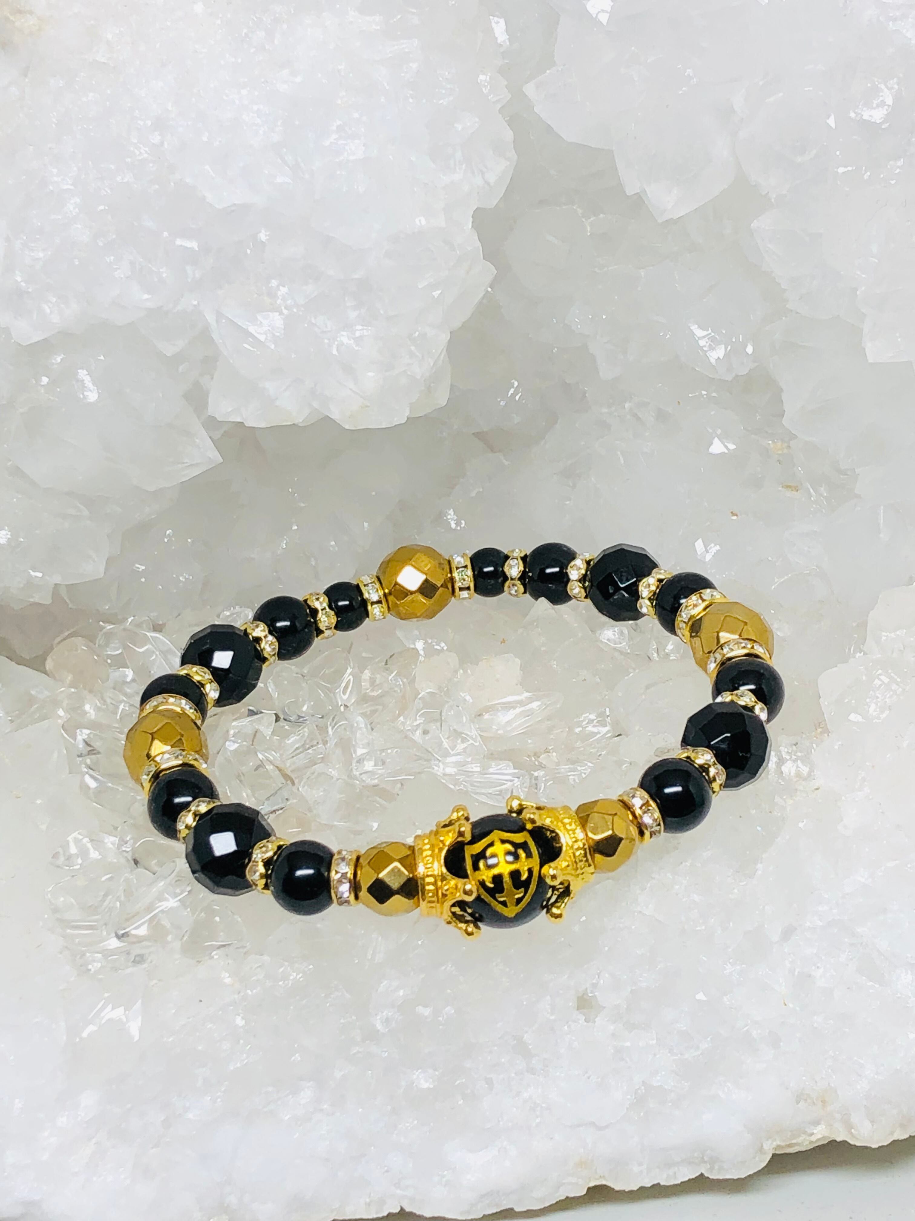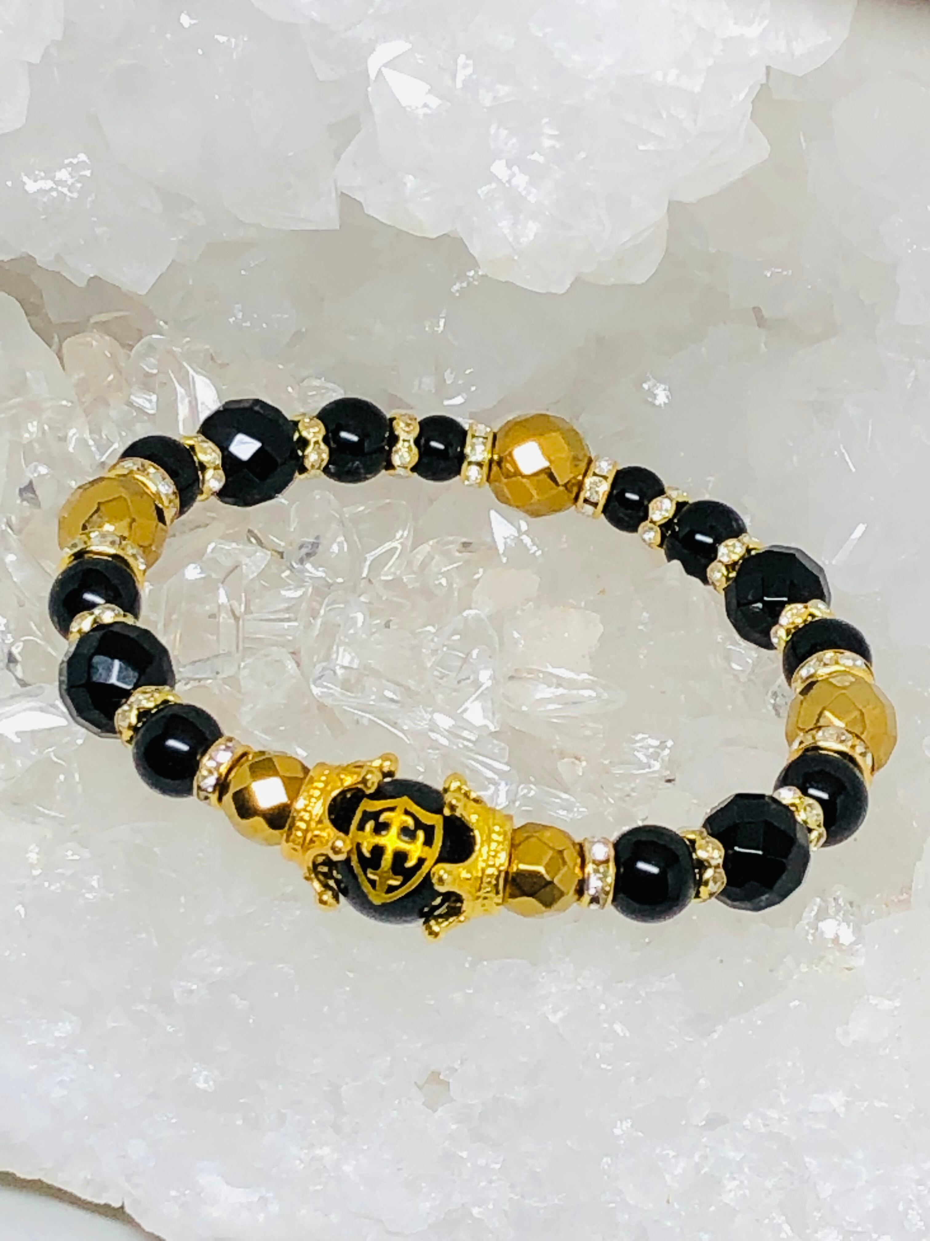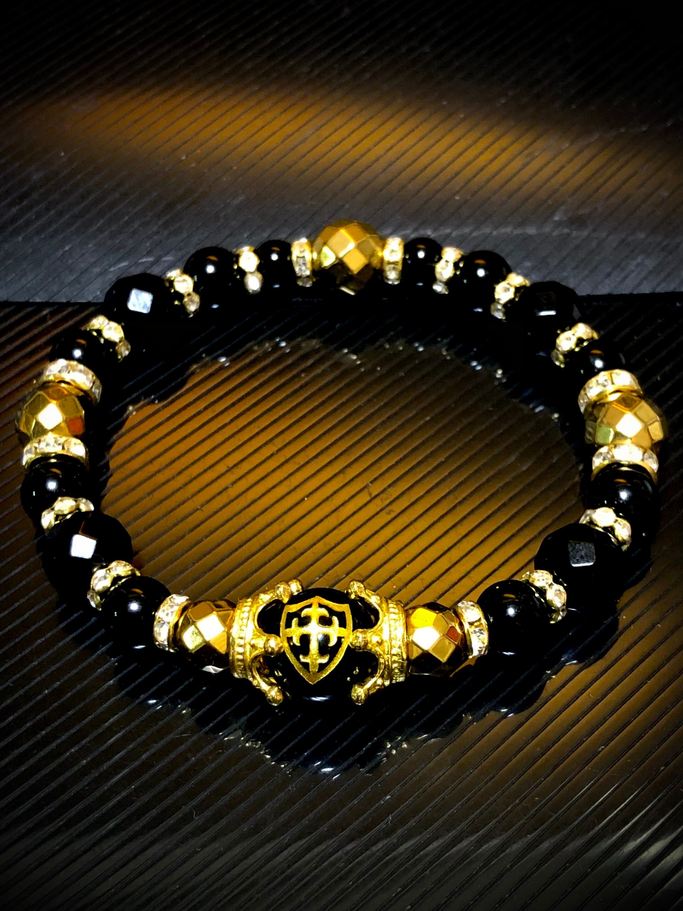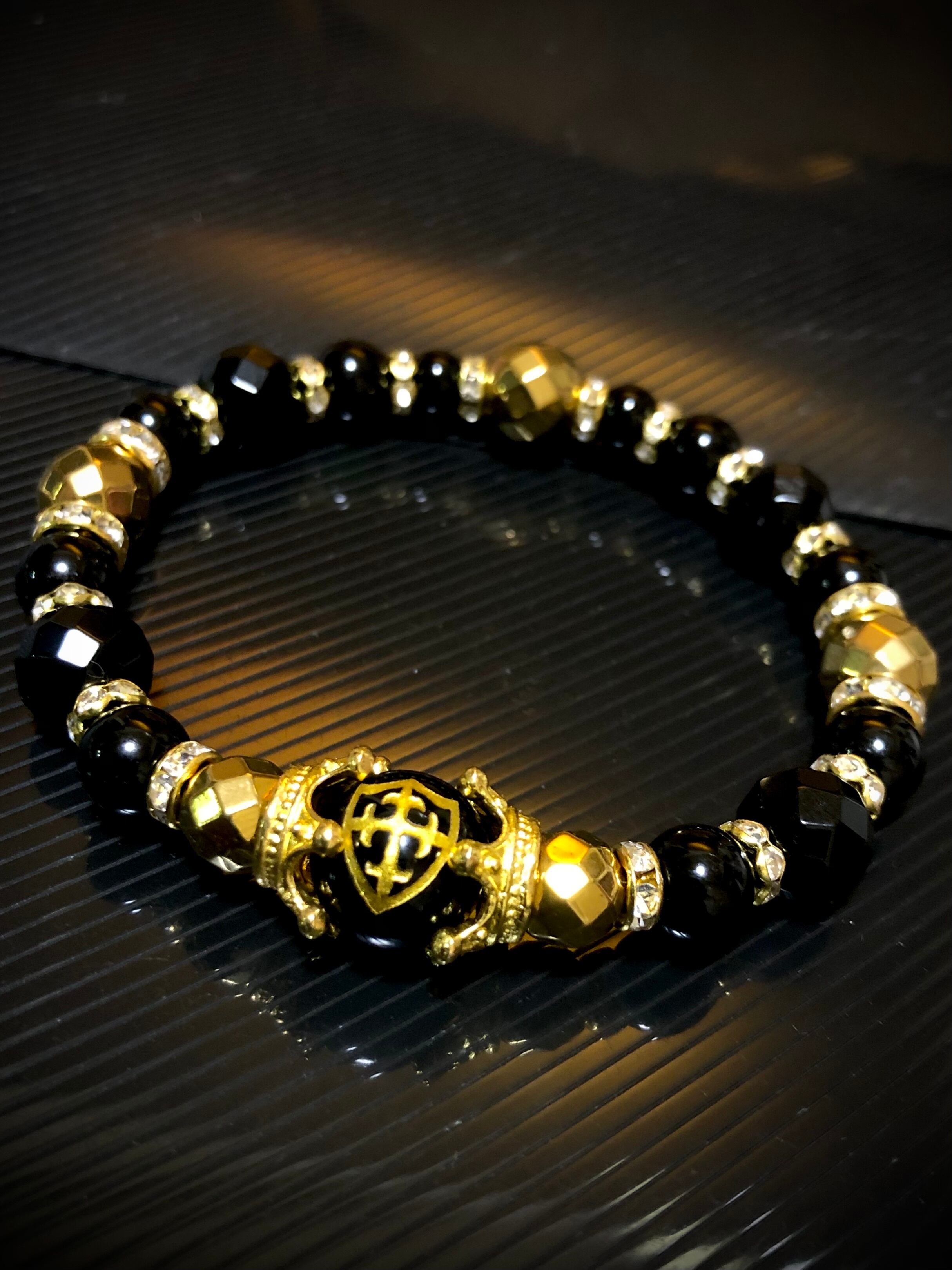 金色 盾 十字架 彫り オニキス 天然石ブレスレット