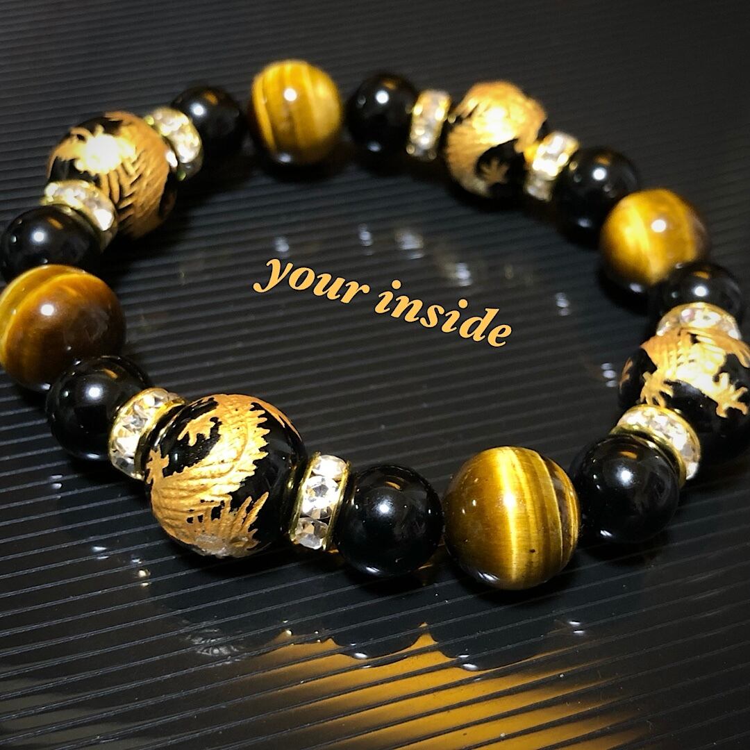 金色 龍彫り オニキス タイガーアイ 天然石ブレスレット