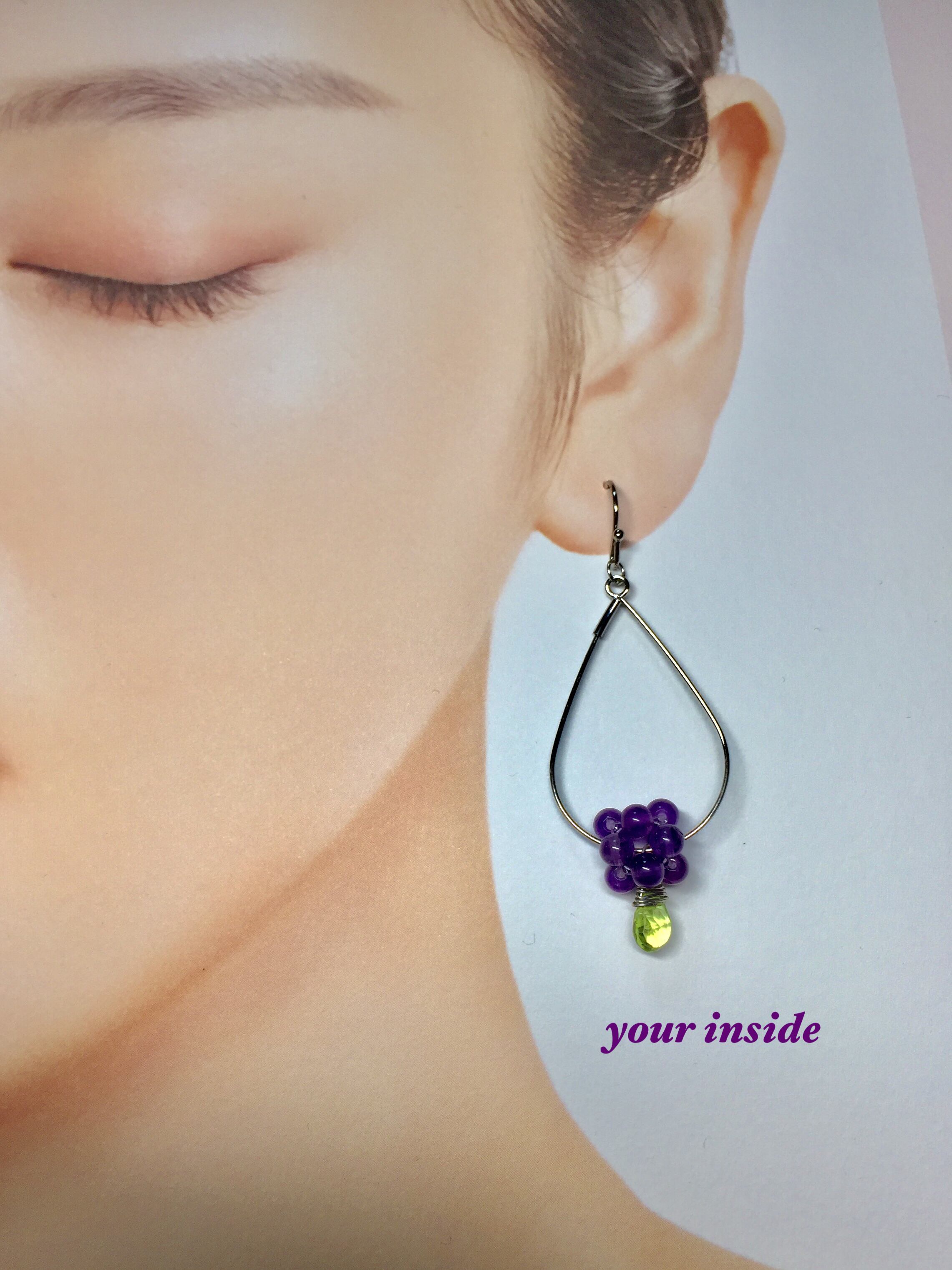 天然石ピアス パワーストーン アメジスト4㎜ ブラジル産 ペリドット ペアシェイプ型 縦6〜7㎜ 横5㎜ アメリカ産 ぶどうピアス ハンドメイド フープピアス フック