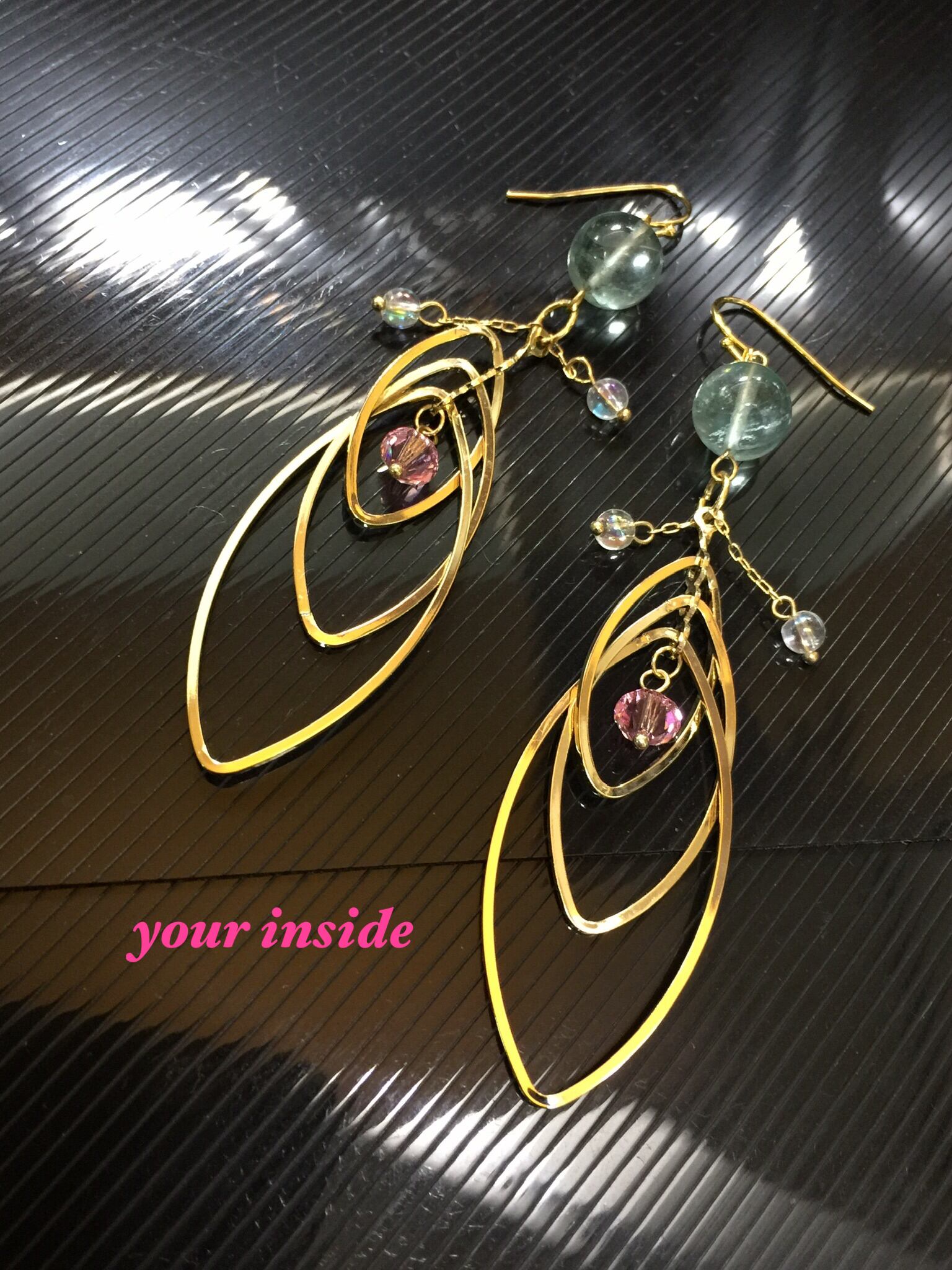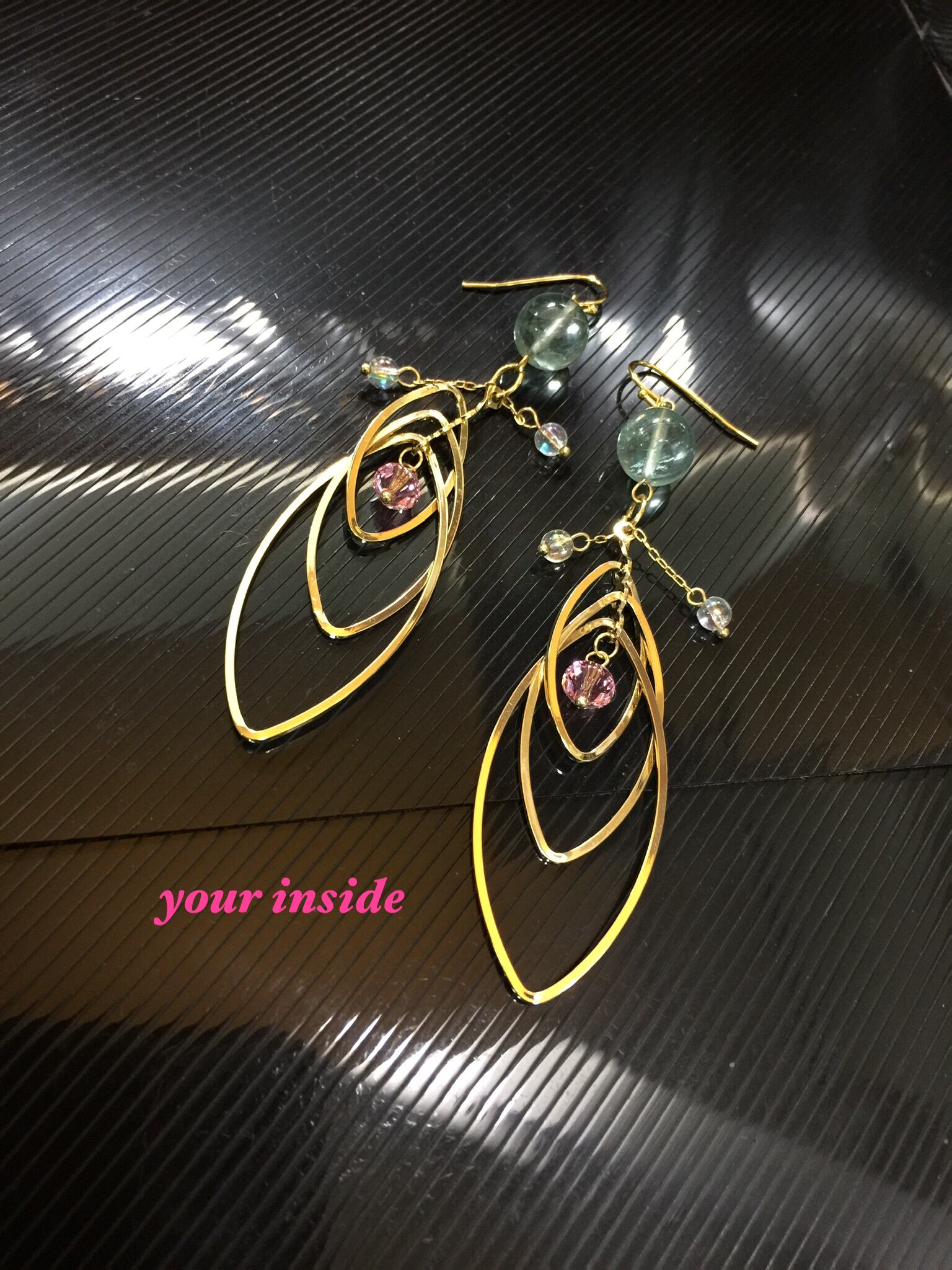 天然石ピアス パワーストーン グリーンフローライト10㎜ コスモオーラ4㎜ ブラジル産 スワロフスキー LT.ローズ6㎜ ハンドメイド ロング フックピアス