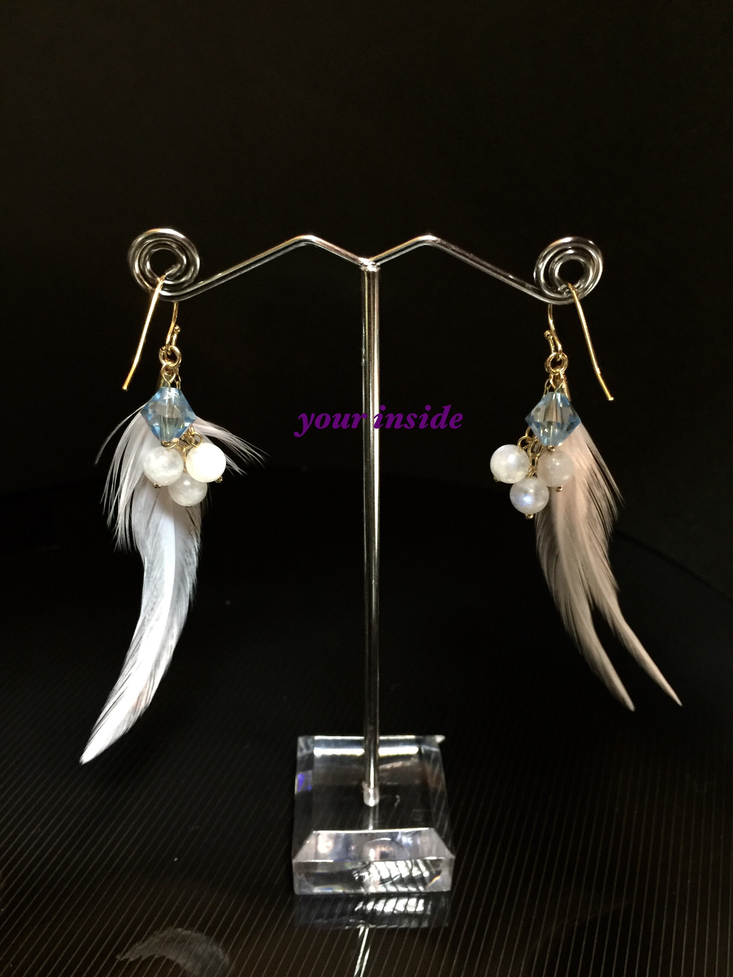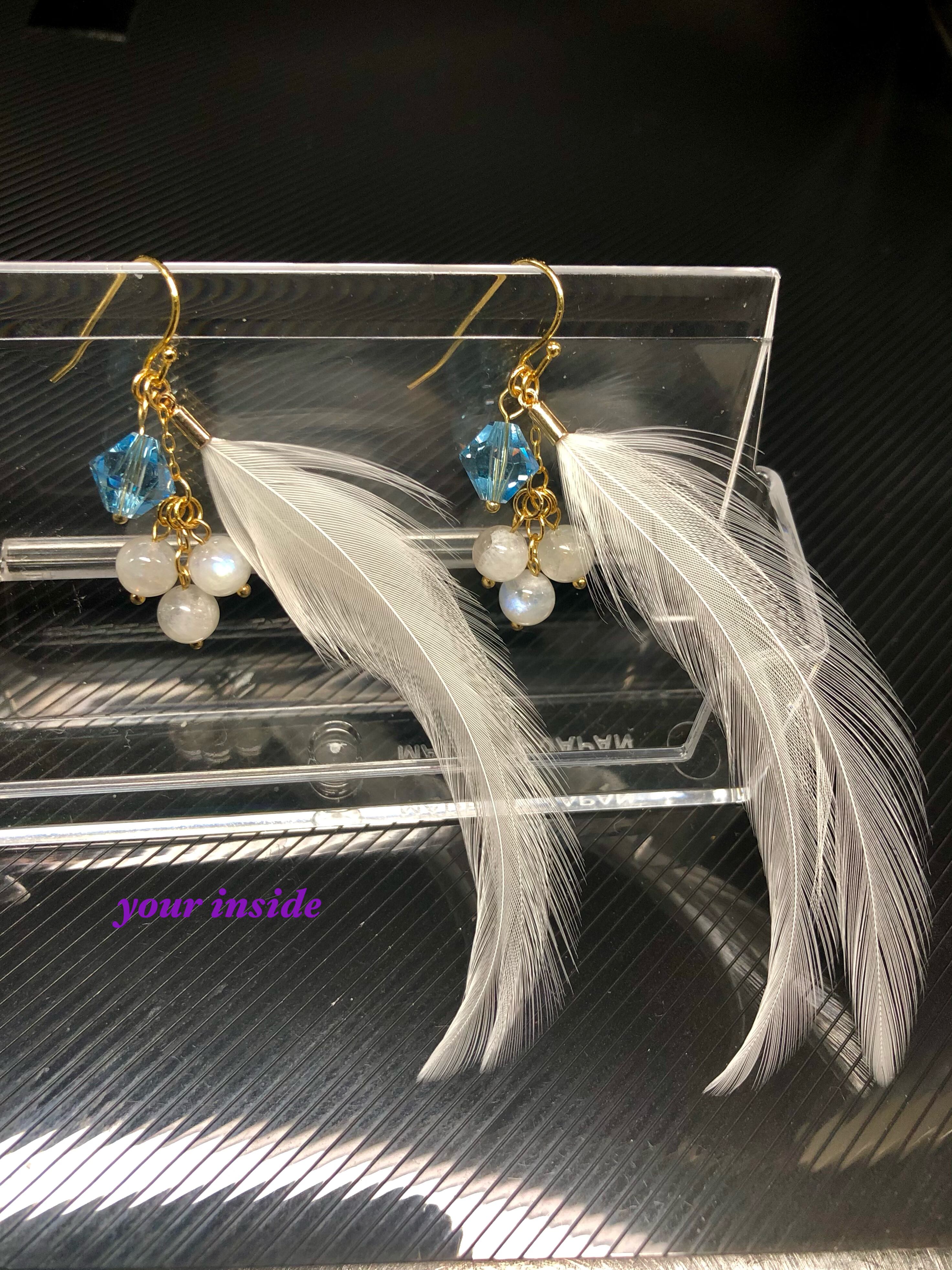 天然石ピアス パワーストーン ブルームーンストーン6㎜ インド産 スワロフスキー アクアマリンカラー8㎜ 羽 フェザー 鶏 ホワイト 約7cm ハンドメイド フックピアス