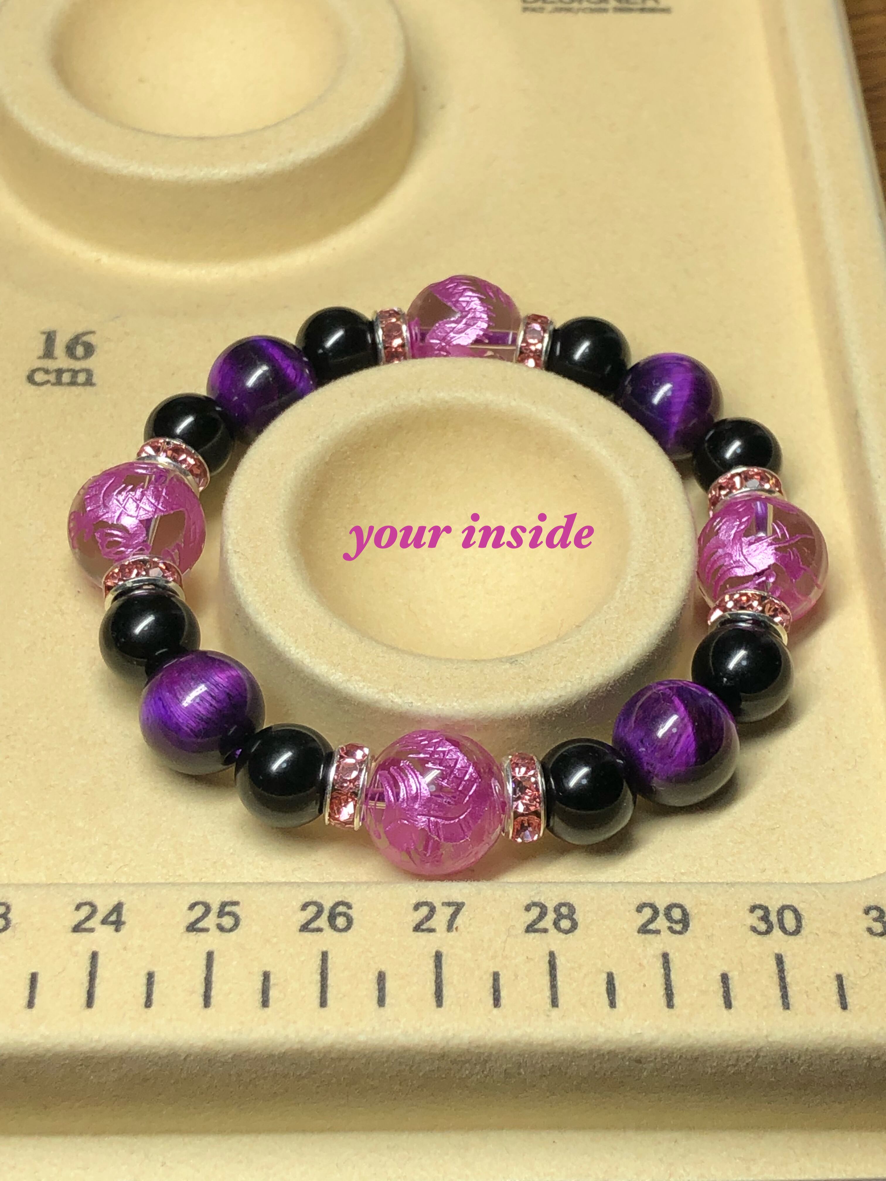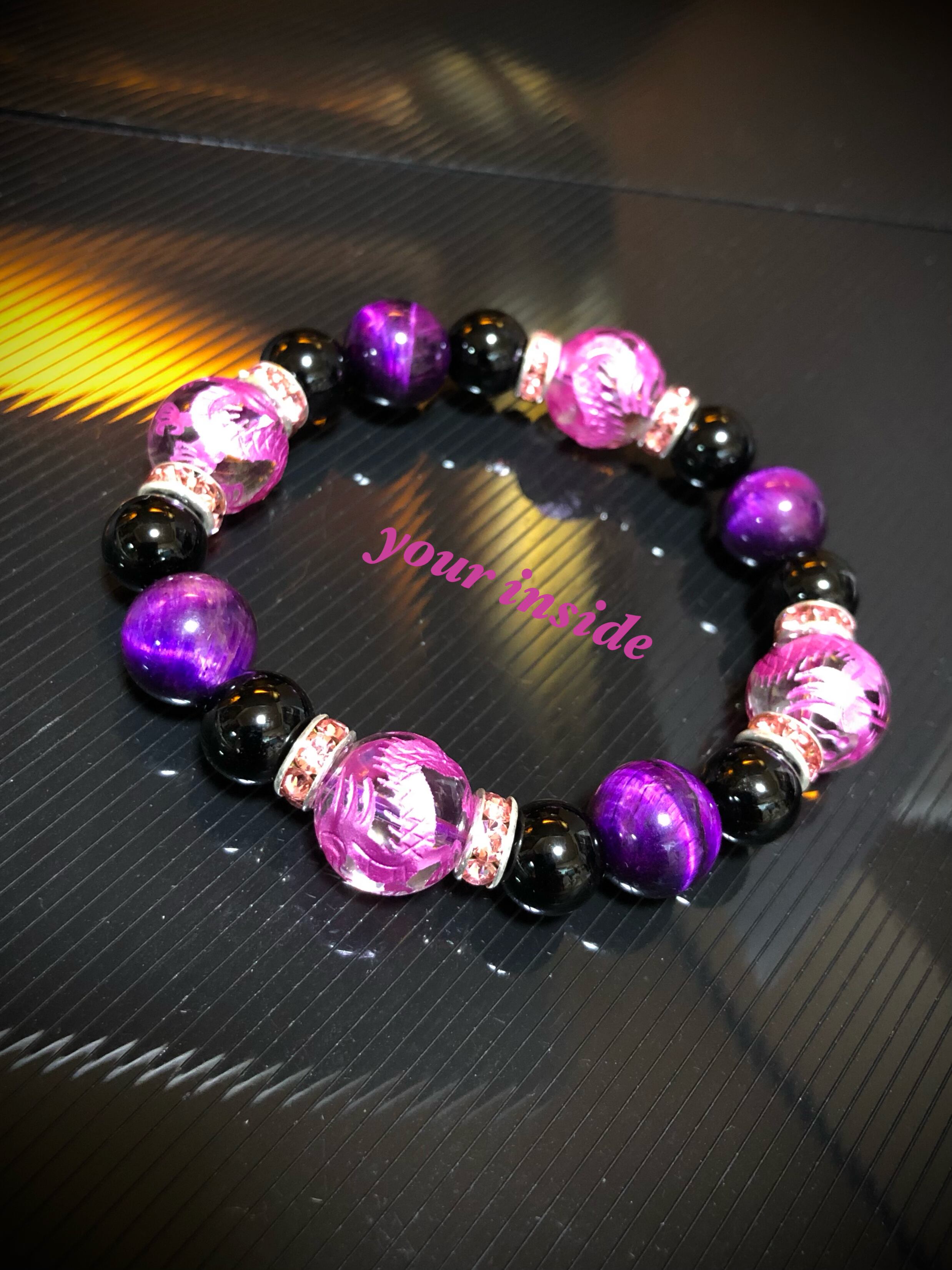 ピンク パープル 龍彫り水晶 パープルカラータイガーアイ 天然石ブレスレット