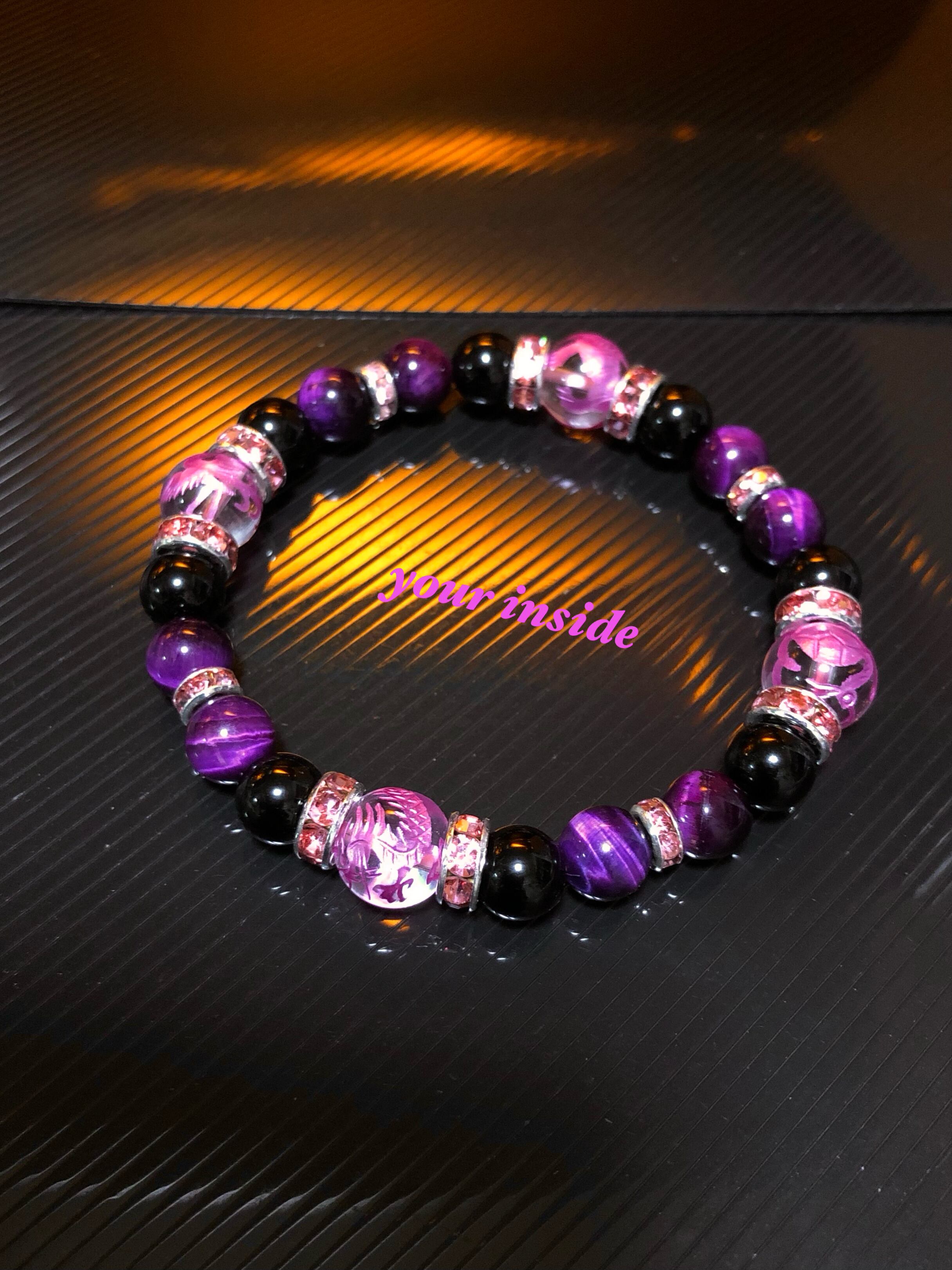四神獣水晶 ピンク パープル 彫り パープルカラータイガーアイ 天然石ブレスレット
