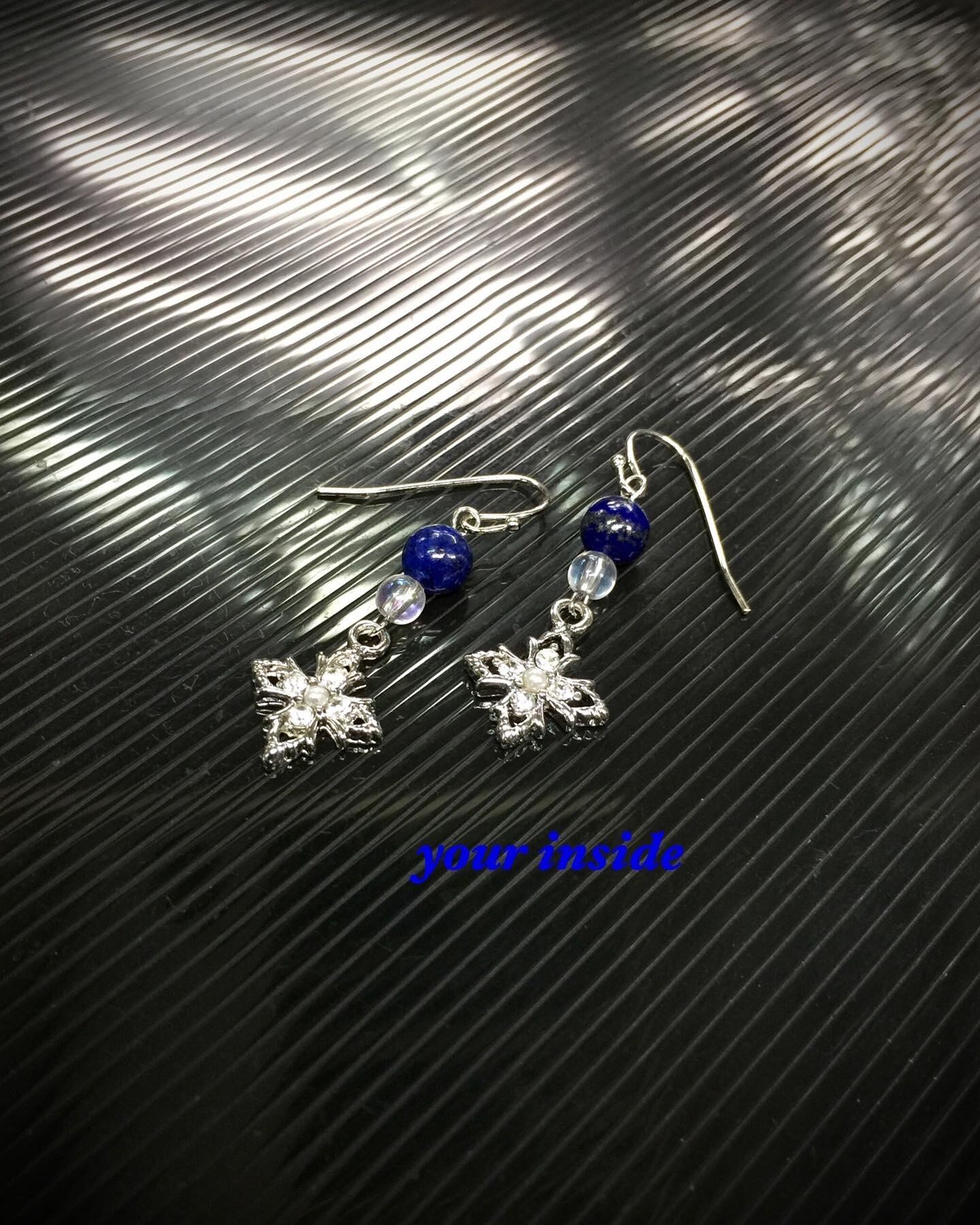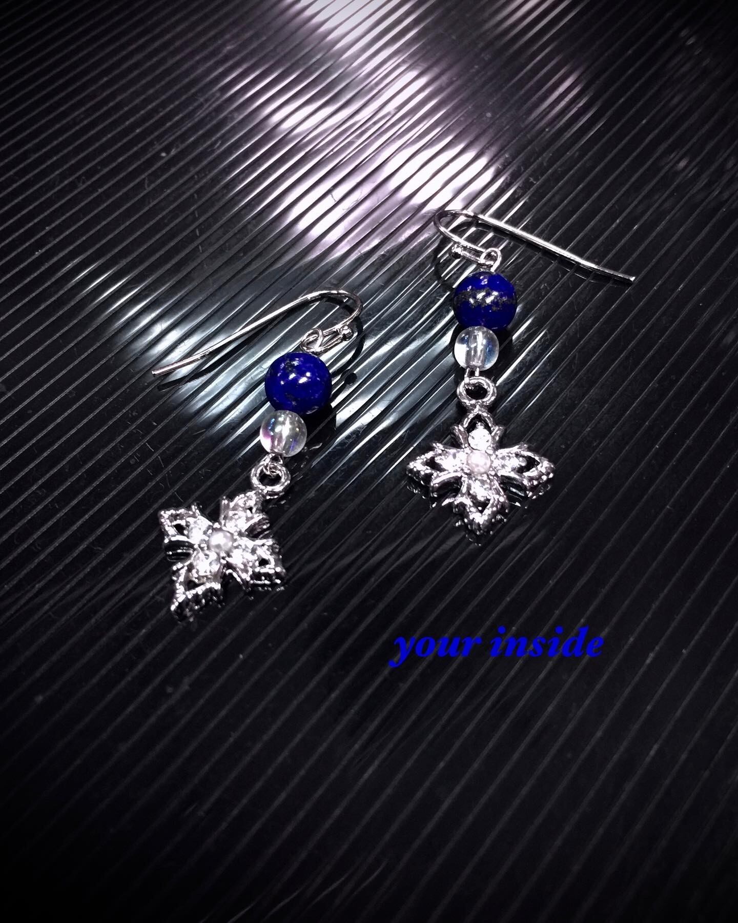 ラピスラズリ約6㎜ アフガニスタン産 コスモオーラ約4㎜ ブラジル産 十字架 クロスチャーム 約13(17)×13㎜ ハンドメイド フックピアス
