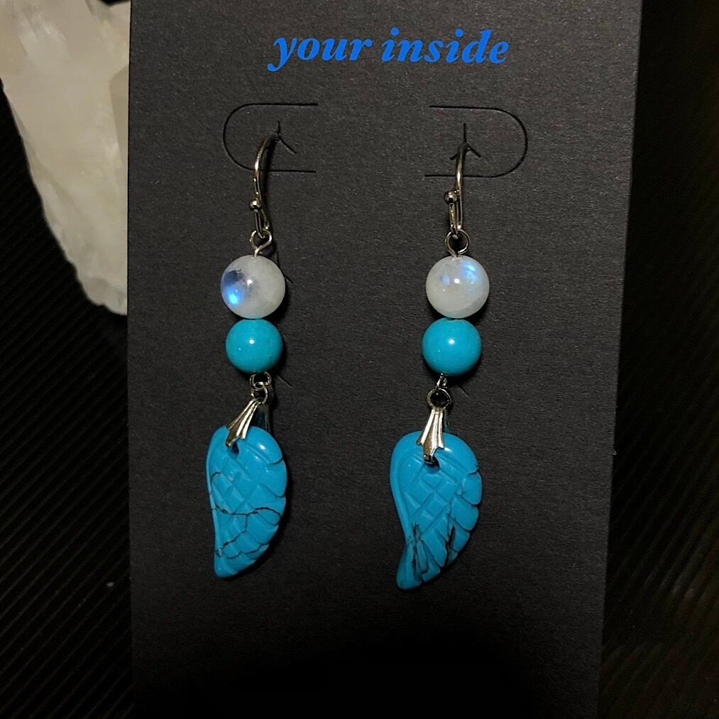 ハウライトターコイズ 羽根 約10×18㎜ ターコイズ 丸珠 約6㎜ トルコ石 アリゾナ産 ブルームーンストーン 約6.5㎜ インド産 ハンドメイド セミロング フックピアス