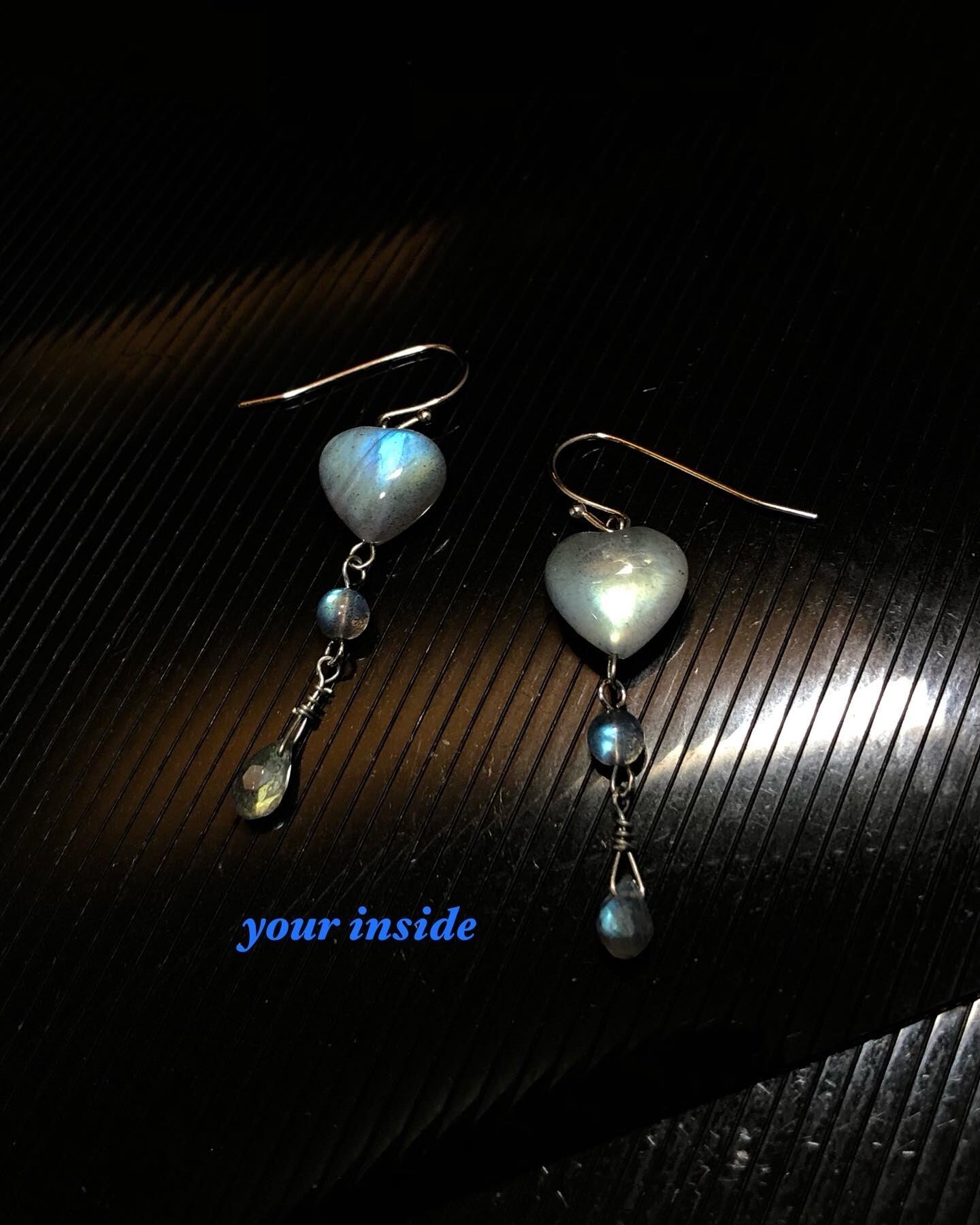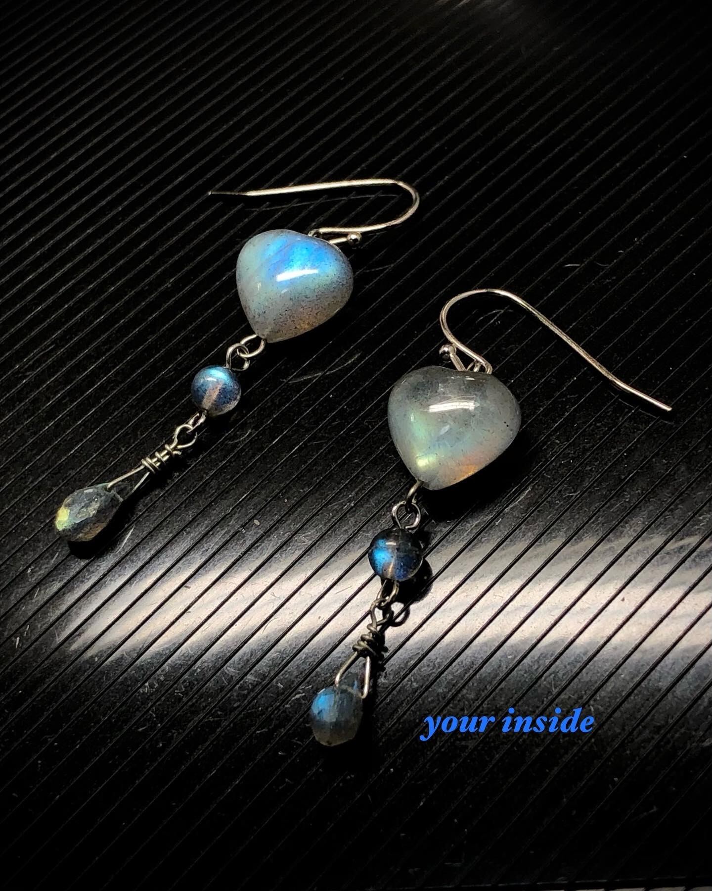 ラブラドライト ハート型 約10㎜ 丸珠約3㎜ しずく型 約3×6㎜ マダガスカル産 ハンドメイド セミロング フックピアス