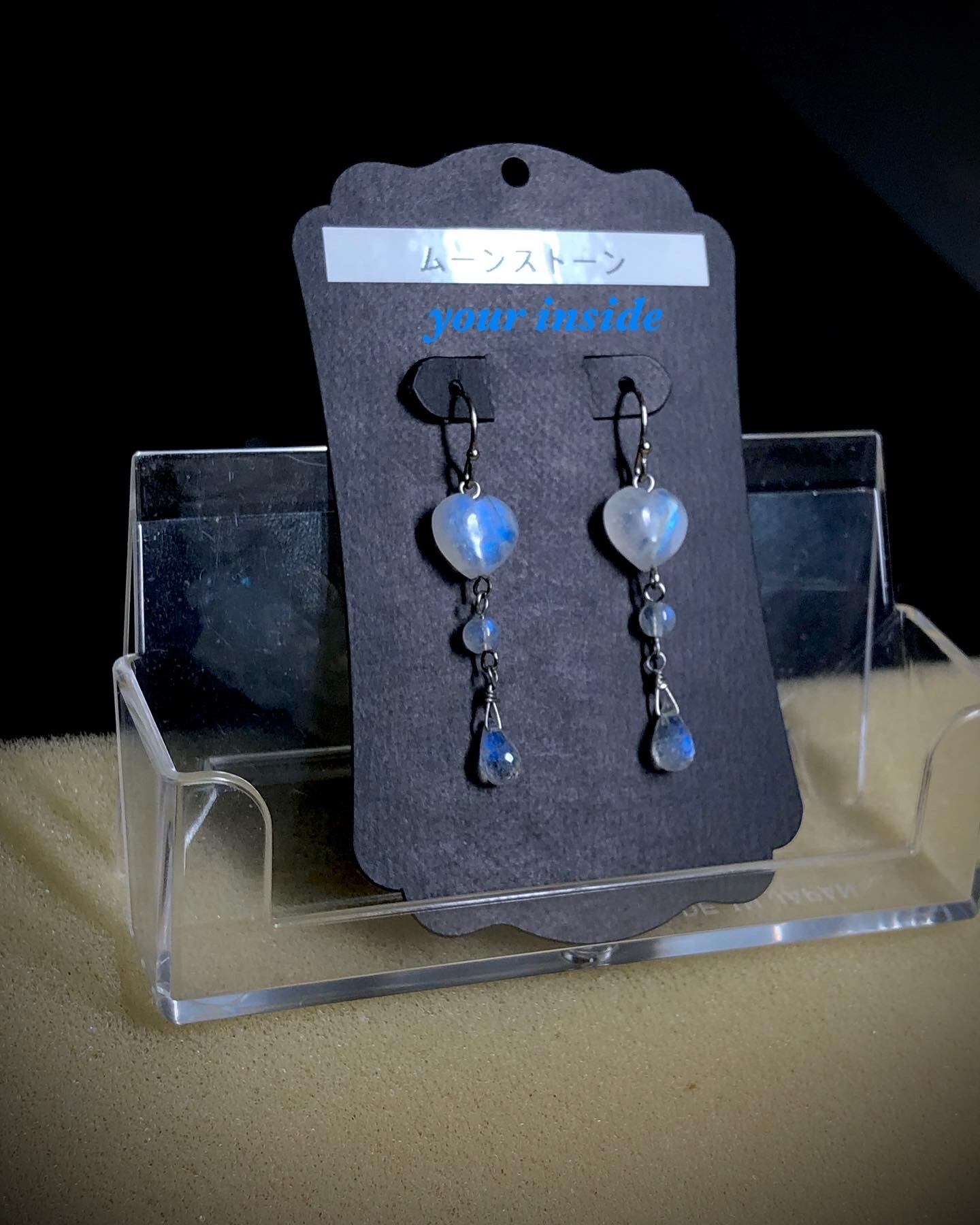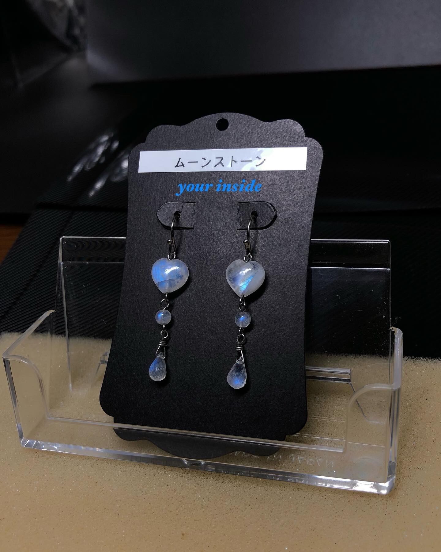 ブルームーンストーン ハート型 約10㎜ 丸珠 約4㎜ しずく型 約3×7㎜ インド産 ハンドメイド セミロング フックピアス