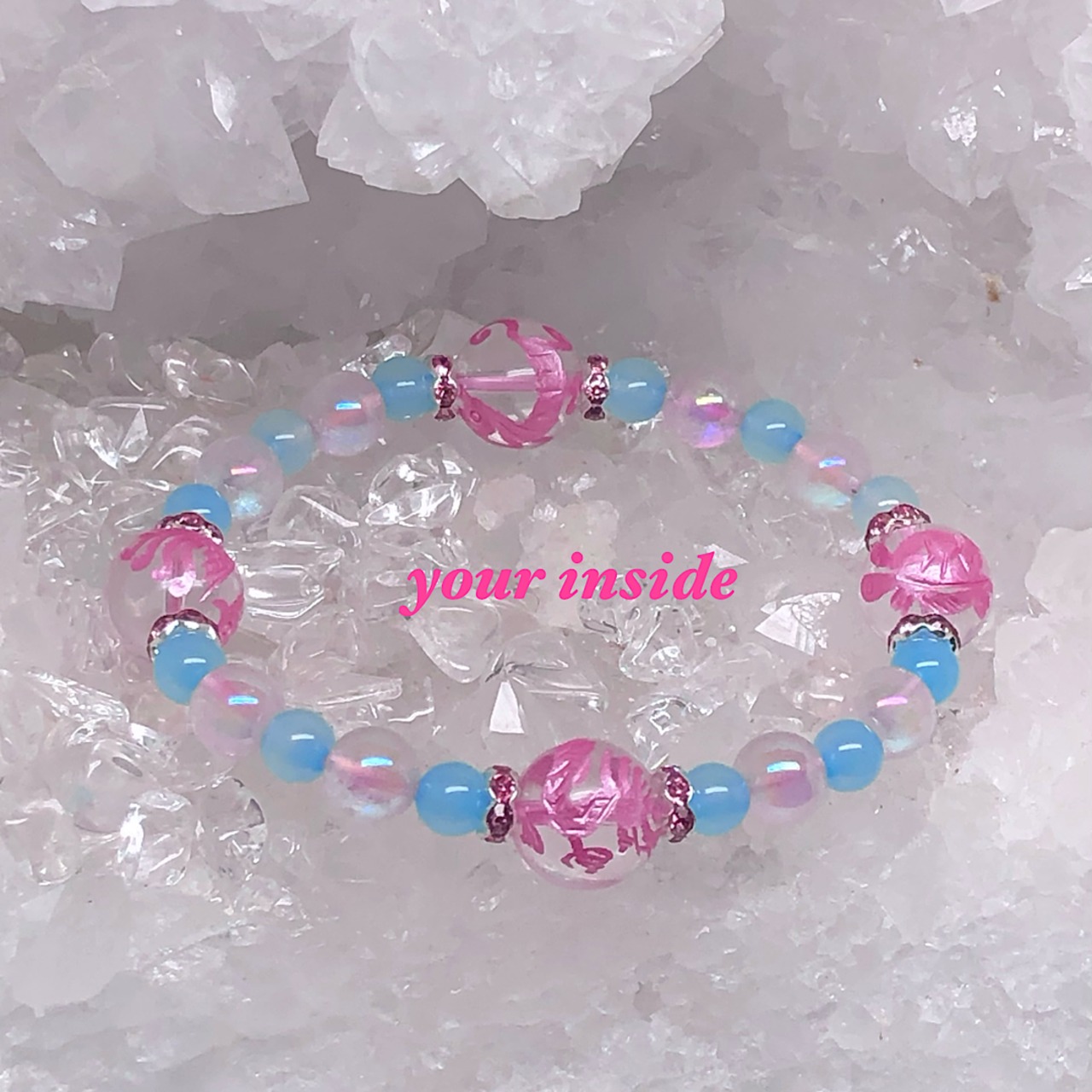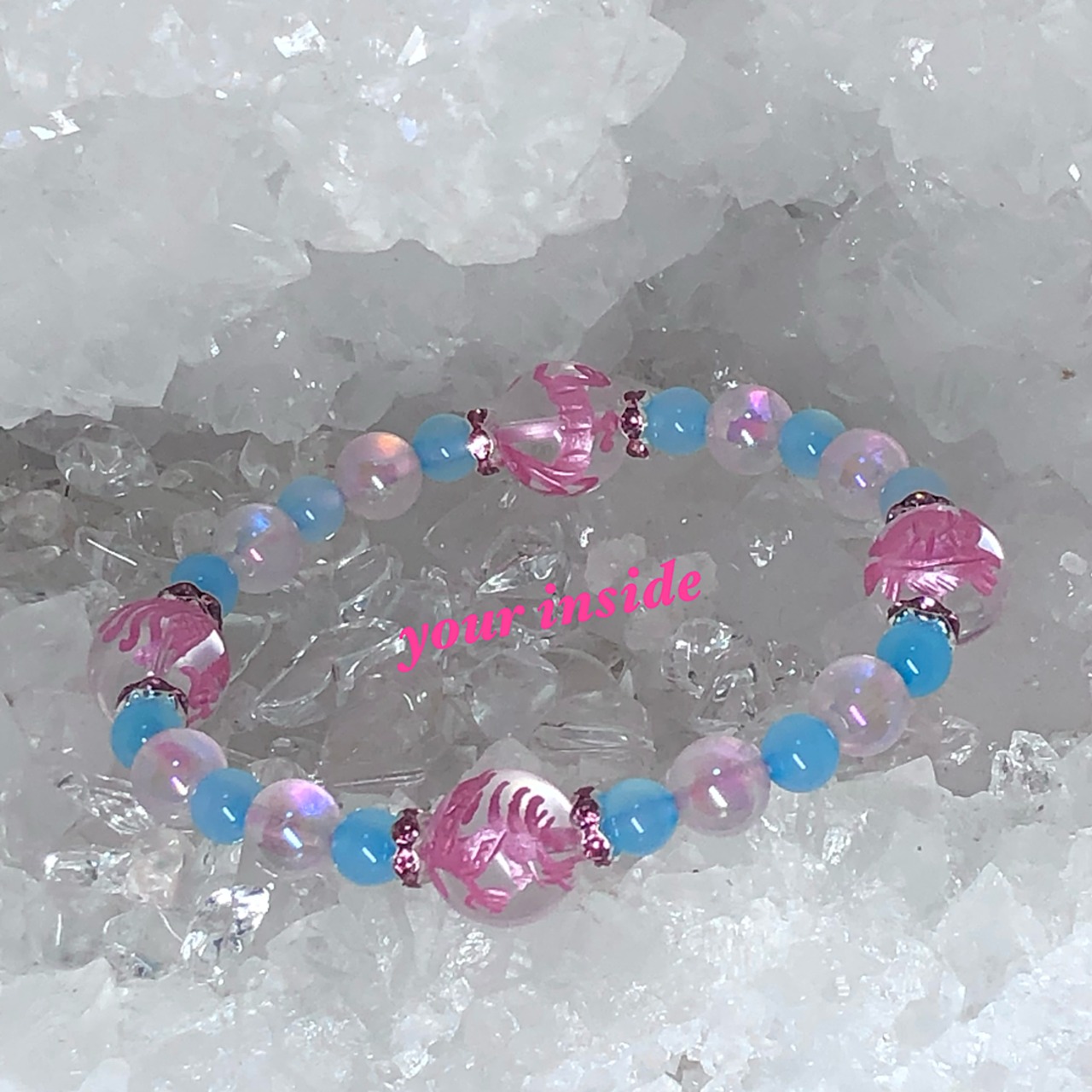 四神獣 ピンク彫り水晶 シーブルーカルセドニー ドラゴン 天然石ブレスレット