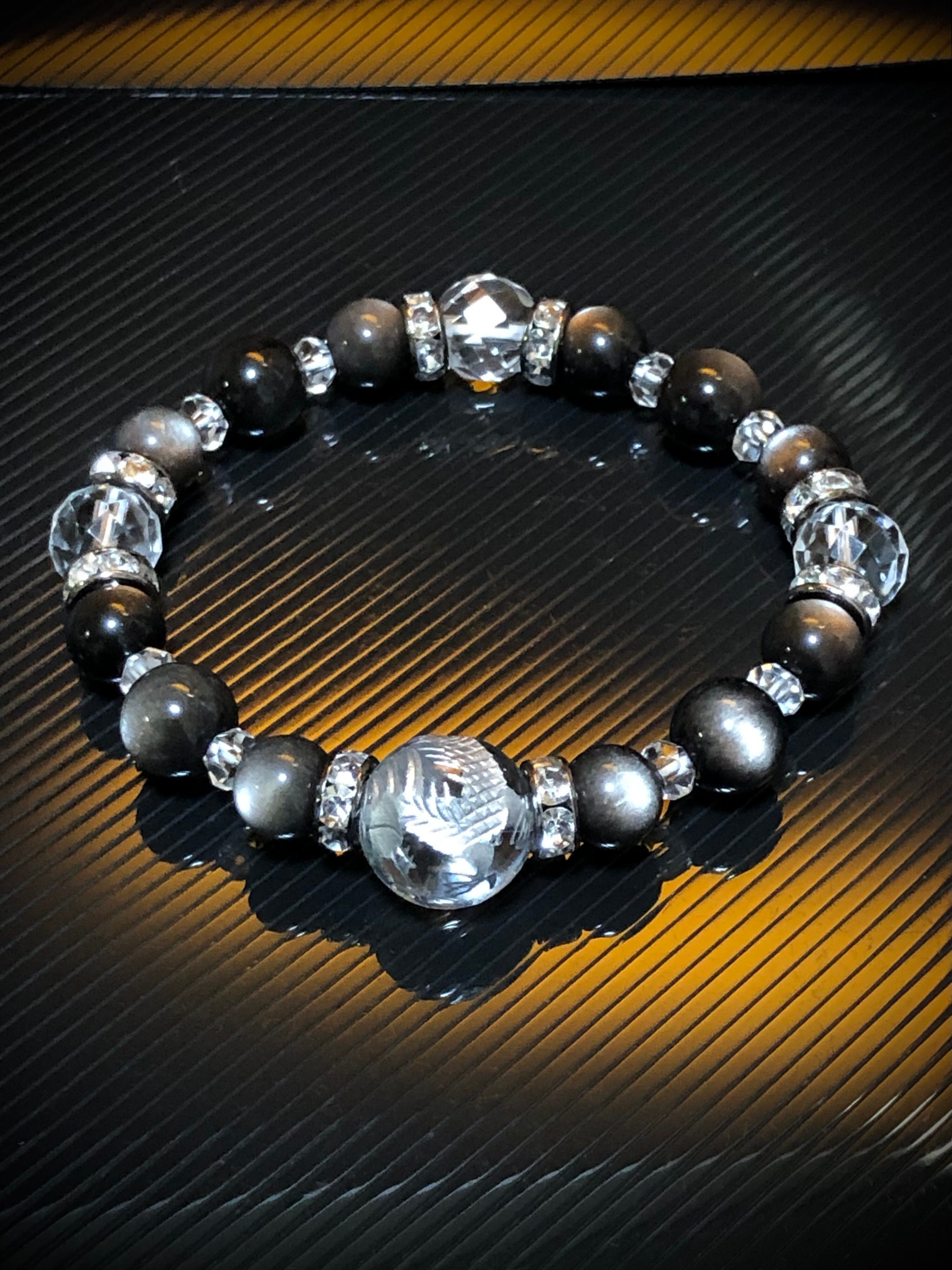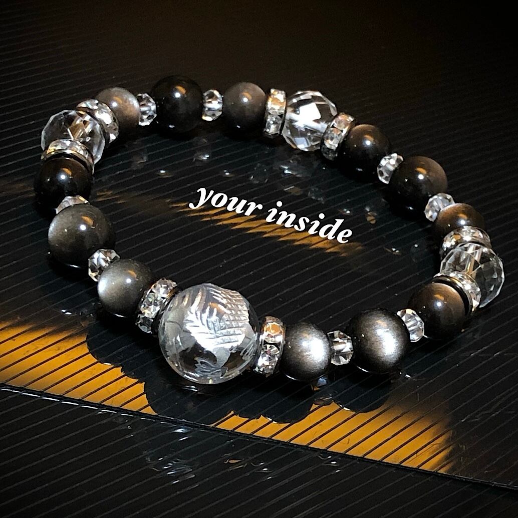 銀色 龍彫り水晶 シルバーオブシディアン 黒曜石 天然石ブレスレット