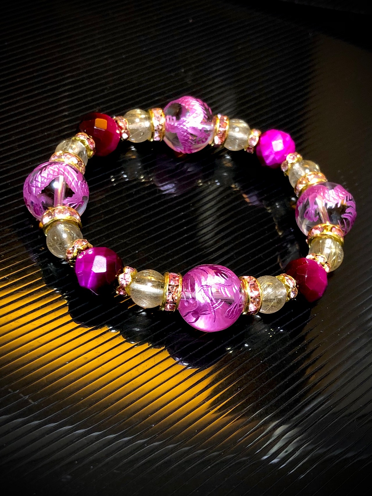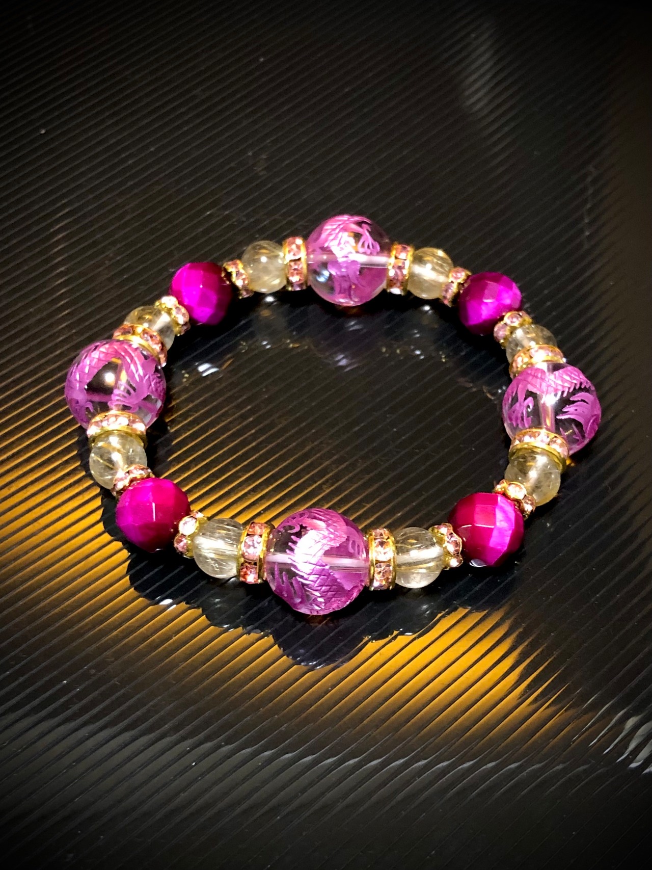 ピンクパープル 龍彫り水晶 ルチルクォーツ ピンクタイガーアイ 64面カット 天然石ブレスレット